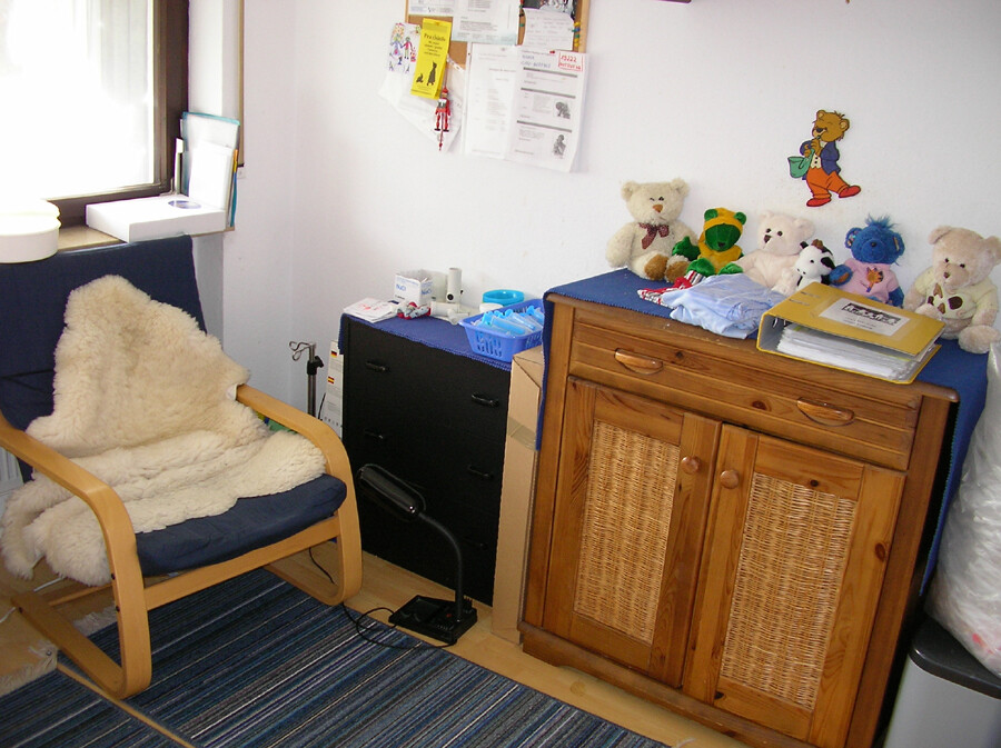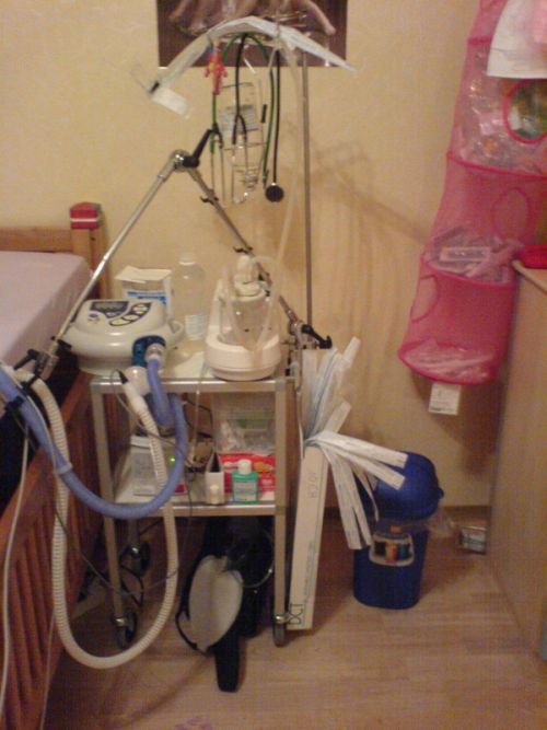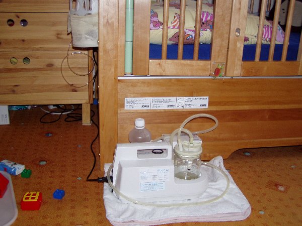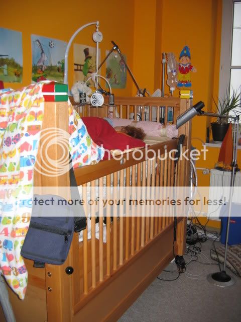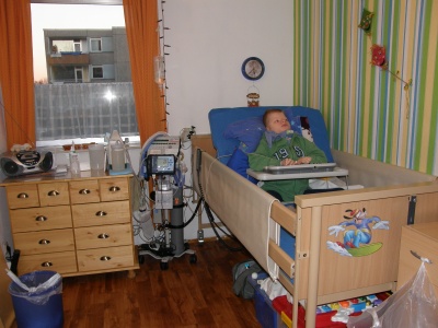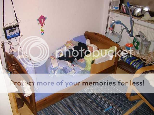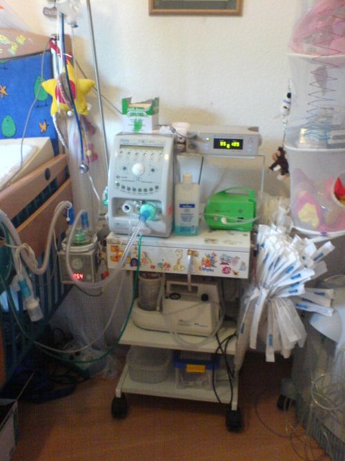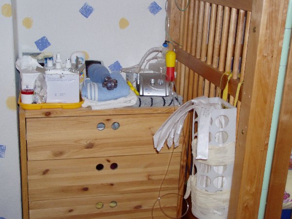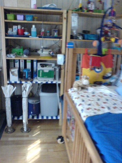 Hier mal ein Bild von Jonas seinem Zimmer - so sieht es aus in unserer kleinen Intensivstation (Absauger, Monitor, Nahrungspumpe, Vernebler)
