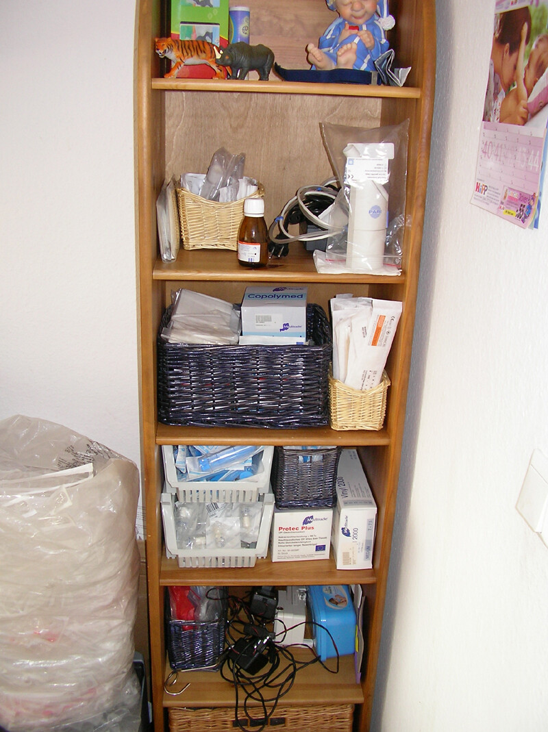 Es folgen mal ein paar Bilder von uns. Wenn ich das mit denen von Euch vergleiche, ist das allerdings die eher sparsame Version. Johanna hat ja (noch) kein Beatmungsgerät und viele der Verbrauchsmaterialien lagern im Hospiz, da sie dort ja überwiegend wohnt.